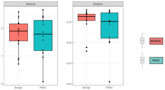 We compared the alpha and beta diversity of the bacterial communities per group (PDAC vs. Benign). Alpha diversity did not significantly differ between sample groups (Figure 2). In regard to beta diversity, we used Aitchison distances as the measure of inter-sample differences in the compositions of gut metagenomes, which revealed a significant difference in average microbiome composition between bile from individuals with PDAC compared to individuals with benign samples by PERMANOVA (p = 0.0173) (Figure 3).