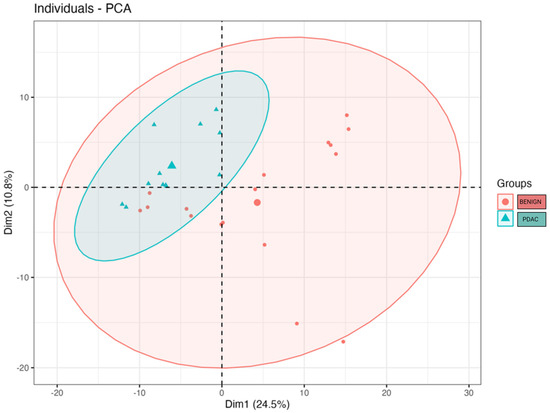 Microbial beta diversity significantly differs between bile from individuals with PDAC vs. bile from individuals with benign samples (p = 0.0173). The clusters were visualised by plotting the first two components that explain up to 35.3% of the variation in the sample space. The large blue triangle and the large red dot represent the centroids of the PDAC and benign sample groups.