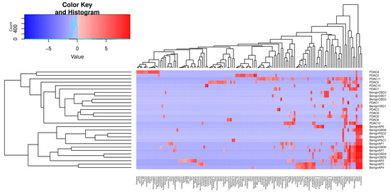 Unsupervised clustering of selected genera abundances separates PDAC from benign samples. The phylogenic tree clustering learned from 135 genera is shown in the x-axis. The y-axis shows the individual samples, which are separated into two major clusters, as shown by the dendrogram on the left. The colour key code is a graphic representation of centre-log ratio (CLR) abundance that uses all taxon read counts within a sample divided by this geometric mean, and the log fold changes in this ratio between samples are compared. If the abundance of a bacteria is lower than the mean CLR value, then it will be negative (blue), and if it is higher, then it will be positive (red).