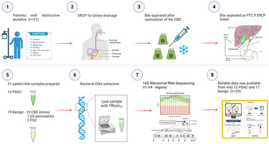 A prospective, non-randomised study in which 31 patients undergoing their first endoscopic retrograde cholangio-pancreatography (ERCP) at the time of obstructive jaundice for benign and malignant pancreatico-biliary disease/strictures were recruited and assessed for their microbial signatures in biliary fluid (Figure 5).