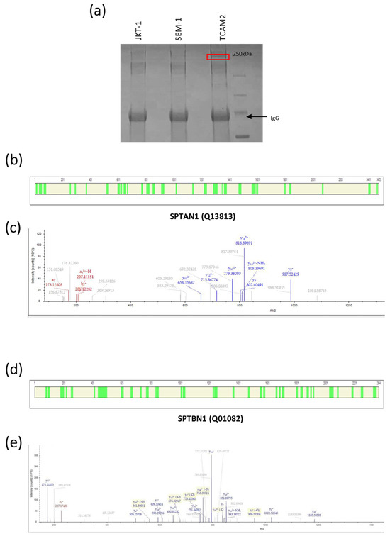 To find out the differential partners involved in the subcellular localization of PTTG1, we performed immunoprecipitation of the securin from the lysates of multiple seminoma cell lines, including JKT-1, SEM-1, and TCAM2. The proteins that were co-immunoprecipitated with PTTG1 were separated by SDS–PAGE, and the bands that were obtained underwent MS proteomic analysis. Figure 1a shows a specific band at 250 kDa exclusively in the TCAM2 cell line on a coomassie stained gel. Among the proteins identified, we found, with high confidence, Spectrin-αII-chain (SPTAN1, Uniprot code Q13813) and Spectrin-βII-chain (SPTBN1, Uniprot code D6W5C0). Tables S1 and S2 list the tryptic unique peptides related to the proteins SPTAN1 and SPTBN1, respectively, in the TCAM2 co-immunoprecipitated lysate. Figure 1 reports the protein coverage obtained by the combination of the tryptic peptides of SPTAN1 (Figure 1b) and SPTBN1 (Figure 1d) and the deconvoluted ESI spectra of representative tryptic fragment peptides related to these proteins, respectively (Figure 1c,e).