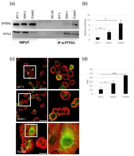 To validate the interaction between PTTG1 and spectrins and their differential reciprocal binding in JKT-1, SEM-1, and TCAM2 seminoma cells, we performed PTTG1 immunoprecipitation and immunofluorescence analysis. We selected SPTBN1 as a subunit of the spectrin complex because of its involvement in cancer [28]. A Western blot of total cell lysates revealed comparable SPTBN1 levels between the three seminoma cell lines (Figure 2a). As expected, co-IP analysis of PTTG1 uncovered differing SPTBN1 interactions, with TCAM2 bearing the highest binding capability (Figure 2a,b). This result validates the proteomic analysis, indicating that the PTTG1-SPTBN1 interaction is a prerogative of TCAM2 cells. Moreover, we used immunofluorescence analysis to further confirm the proteins’ colocalization. As reported in Figure 2c,d, the interaction of PTTG1 and SPTBN1 is different between the cell lines, with TCAM2 showing the highest levels of binding. Intriguingly, the increased binding of PTTG1 and SPTBN1 in JKT-1, SEM-1, and TCAM2 negatively correlates with the previously reported nuclear localization of PTTG1 and the aggressive behavior of the three cell lines [19].