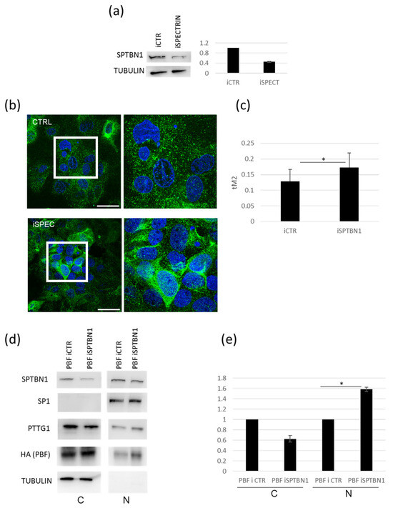 Since we uncovered SPTBN1 as a TCAM2-specific PTTG1 partner, we wondered if SPTBN1 could play a role in the differential subcellular localization of this securin. In fact, we formerly reported that TCAM2 retains the lowest nuclear localization of PTTG1 when compared to the other two seminoma cellular models [19]. In order to address the question, we downregulated SPTBN1 levels by siRNA in TCAM2 cells (Figure 3a). The efficiency of SPTBN1 silencing was about 60% (Figure 3a, right panel). Figure 3b,c show the immunofluorescence analysis of the subcellular localization of PTTG1 upon SPTBN1 silencing. As expected, the downregulation of SPTBN1 in TCAM2 cells led to a significant increase in PTTG1 in the nuclear fraction (Figure 3b,c). Furthermore, we analysed by western-blot the subcellular localization of PTTG1 following the treatment of TCAM2 cells with siRNA targeting SPTBN1 in combination with the overexpression of PBF, a well-known mediator of PTTG1’s nuclear translocation [22]. We found that SPTBN1 downregulation mediated a decrease in cytoplasmic PTTG1 localization along with a significant increase in its nuclear fraction (Figure 3d,e). All together, these findings support our hypothesis about the role of SPTBN1 as a PTTG1 interactor that has the specific ability to mediate PTTG1’s cytoplasmic restraint in TCAM2 cells.