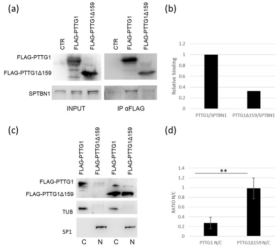 To understand the PTTG1/SPTBN1 binding in more depth, we made use of a PTTG1 deletion mutant (PTTG1Δ159) lacking the SH3 interacting domain [32]. As shown in Figure 4a,b, PTTG1Δ159 binds SPTBN1 to a lesser extent (about 30%) in comparison to wild-type PTTG1 in TCAM2 cells. The subcellular fractionation revealed that wt-PTTG1 is mainly localized in the cytoplasm, as expected, whereas the mutant form was strongly localized in the nucleus (Figure 4c). Importantly, the quantification analysis showed a highly significant increase in the nuclear/cytoplasmic ratio (N/C) of the PTTG1-deletion mutant in comparison to the wild-type form (Figure 4d). Overall, these results further suggest a specific role for SPTBN1 in the cytoplasmic constraint of PTTG1.