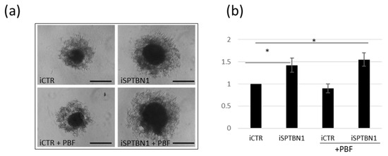 To find out whether the observed PTTG1/SPTBN1 interaction involved in the maintenance of PTTG1 outside of the nucleus has a functional impact on TCAM2 cell behaviour, we used a 3D sphere-forming assay. As reported in Figure 5a,b SPTBN1 downregulation caused a significant increase in TCAM2 sphere-forming ability both alone and with, albeit slight, additive effect of PBF overexpression . This result confirms our previous finding about the crucial role that the nuclear localization of PTTG1 plays in promoting its oncogenic activity, which is prevented, at least in part, by its SPTBN1-mediated cytoplasmic restraint.