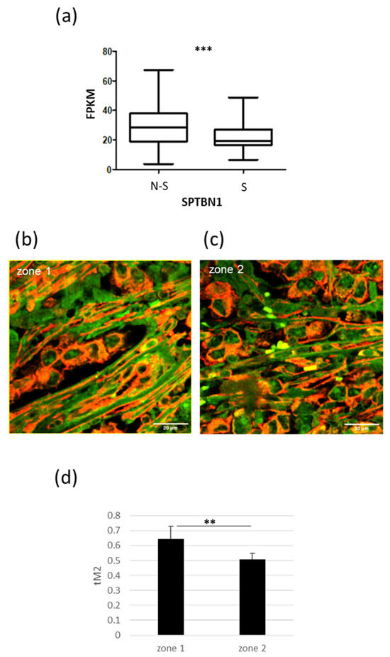 Interplay of PTTG1/SPTBN1 in human seminoma specimens. (a) Box plot of mRNA levels of SPTBN1 in non-seminoma (N-S; N = 65) and seminoma (S; N = 68) specimens in Atlas database (https://www.proteinatlas.org/ENSG00000115306-SPTBN1/pathology/testis+cancer (accessed on 8 September 2023) (*** = p < 0.001). (b,c) Representative pictures of merged confocal immunofluorescence analyses of PTTG1 (green) and SPTBN1 (red) in a human seminoma specimen. The PTTG1-SPTBN1 colocalized pixels are shown in yellow. Zone 1 indicates areas with predominantly cytoplasmic PTTG1. Zone 2 indicates areas with more noticeable nuclear PTTG1 localization. Scale bar: 20 µm. (d) Histogram reports the value of tM2 colocalization coefficient of PTTG1-SPTBN1, expressed as a percentage. For each zone five fields were counted (n = 150 for zone 1, n = 200 for zone 2; ** = p < 0.01, two-tailed unpaired t-test).