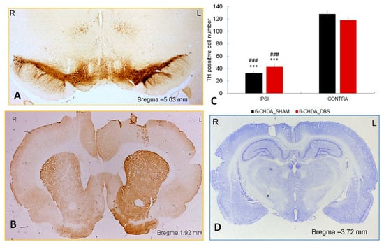 Verification of 6-OHDA lesion (A,B) and electrode placement (D). Photomicrographs (representative rat from 6-OHDA_DBS group) of substantia nigra (A) and striatum (B)—TH-immunostained sections from rat sacrificed 7 days after DBS-STN, applied on the next day after 6-OHDA nigral injection (L—left, R—right hemisphere), and tip (asterisk) of stimulating electrode located in right STN (D). Graph (C) shows the number of TH+ cells in the substantia nigra pars compacta, counted using stereology in 6-OHDA_DBS (n = 18) and 6-OHDA_SHAM (n = 18) rats in IPSI (right) and CONTRA—lateral hemisphere to the DBS-STN. Data are represented as means ± SEM. *** p < 0.001 vs. 6-OHDA_SHAM CONTRA; ### p < 0.001 vs. 6-OHDA_DBS CONTRA, Tukey HSD after ANOVA.