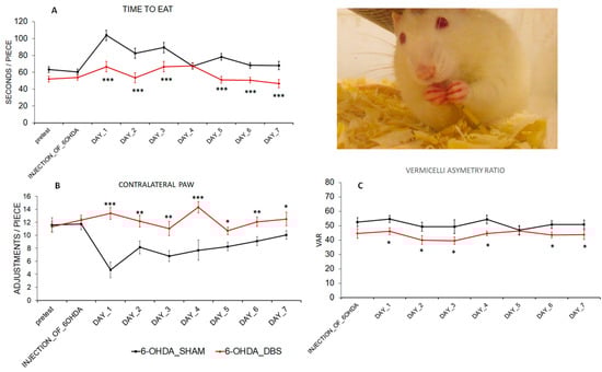 The Kruskal–Wallis test revealed that 6-OHDA_DBS rats have significantly shorter eating times for a single piece of pasta from day 1 to 3 and from day 5 to 7 of the stimulation procedure (DAY_1 to DAY_3 and DAY_5 to DAY_7) in comparison to the 6-OHDA_SHAM group [DAY_1 (H = 15.84; p ≤ 0.001), DAY_2 (H = 12.75; p ≤ 0.001), DAY_3 (H = 6.86; p ≤ 0.001), DAY_5 (H = 22.97; p ≤ 0.001), DAY_6 (H = 16.49; p ≤ 0.001), DAY_7 (H = 20.50; p ≤ 0.001)] (Figure 2A). The Kruskal–Wallis test confirmed, also, that the number of contralateral paw adjustments increased after each day of DBS_STN (DAY_1 (H = 24.85 p ≤ 0.001), DAY_2 (H = 6.93 p ≤ 0.01), DAY_3 (H = 7.53 p ≤ 0.01), DAY_4 (H = 11.27; p ≤ 0.001), DAY_5 (H = 6.39; p ≤ 0.05; DAY_6 (H = 6.74 p ≤ 0.01), DAY_7 (H = 4.79 p ≤ 0.05), Figure 2B). In parallel with increased contralateral paw efficiency, the VAR was reduced in 6-OHDA_DBS rats (DAY_1 (H = 3. 83; p ≤ 0.01), DAY_2 (H = 4.55; p ≤ 0.01), DAY_3 (H = 5.03; p ≤ 0.01), DAY_5 (H = 3.21; p ≤ 0.05), DAY_6 (H = 3.30; p ≤ 0.01), DAY_7 (H = 5.52; p ≤ 0.01), Figure 2C), which was substantiated through Kruskal–Wallis testing.
