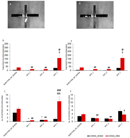 Effect of DBS-STN on anxiety-like behaviors in rats with early-stage PD. (A,D) EPM test conditions during exploration of open or closed arms of maze. (B,E) Number of entries into the open or closed arms of maze before PD model induction (injection_of_6-OHDA) and after one (DAY_1), two (DAY_2), or seven days (DAY_7) of DBS-STN (6-OHDA_DBS, n = 6) or SHAM (6-OHDA_SHAM, n = 6). (C,F) The cumulative durations of time spent in open or closed arms of EPM, measured at this same point of procedure in both groups. Data are means ± SEM. Explanation: * p < 0.05 differences vs. baseline (injection_of_6-OHDA) for 6_OHDA_SHAM; ## p < 0.01 differences vs. baseline (injection_of_6-OHDA) for 6_OHDA_DBS; @ p < 0.05, @@ p < 0.01 differences vs. 6-OHDA_SHAM; $ p < 0.05, $$$ p < 0.01 differences vs. DAY_1 of DBS-STN procedure applied in 6-OHDA_DBS (Kruskal–Wallis test and post-hoc Dunn test).