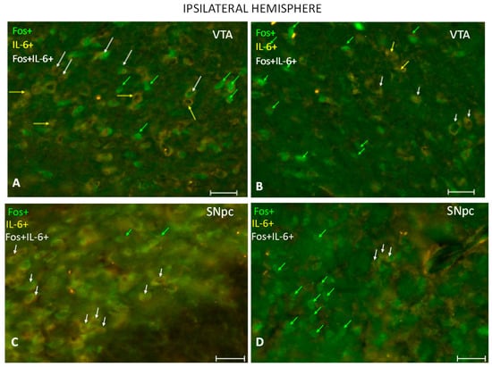 The immunofluorescence study showed that the number of IL-6+- and cFos+-containing cells in SNpc and VTA dopaminergic regions in the hemisphere ipsilateral to a lesion were affected by DBS-STN applied in the 6-OHDA-induced model of PD (Figure 4A–F). The Tukey post-hoc test after the one-way ANOVA confirmed elevated percentages of cFos–positive cells in the VTA (F (3.23) = 3.544; p < 0.05; Figure 4E) and SNpc (F (3.23) = 3.804; p < 0.05; Figure 4F) located in the ipsilateral hemisphere in comparison to the percentages of cells observed in the same hemisphere of 6-OHDA_SHAM. In the same brain structures, the percentages of IL-6-positive labeled cells were reduced (F (3.23) = 4.238; p < 0.05 and F (3.23) = 3.804; p < 0.05; Figure 4E,F, Tukey post-hoc). Interestingly, the percentage of double-labeled cells (Fos+/IL-6) after DBS-STN was reduced only in the SNpc (F (3.23) = 3.566; p < 0.05, Tukey post-hoc).