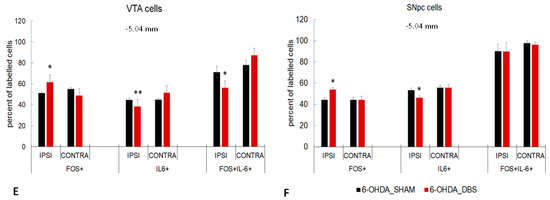 Effect of DBS-STN on neuroinflammation and cell activation in dopaminergic structures of nigrostriatal and mesolimbic systems. (A–D) IL-6-immunoreactive (yellow arrows), cFos-immunoreactive (green arrows), and double-labeled IL-6/Fos-immunoreactive (white arrows indicate cells with colocalization) cells in the VTA and SNpc, localized in the ipsilateral-to-stimulation brain hemisphere in the representative rats subjected to SHAM (6-OHDA_SHAM) or DBS-STN (6-OHDA_SHAM). The scale bar is 10 µm. (E,F) Percentages of labeled cells in both brain hemispheres (IPSI, CONTRA) in VTA and SNpc. Data are means ± SEM. Explanation: * p < 0.05, ** p < 0.01, differences vs. 6_OHDA_SHAM; Tukey HSD after ANOVAs.