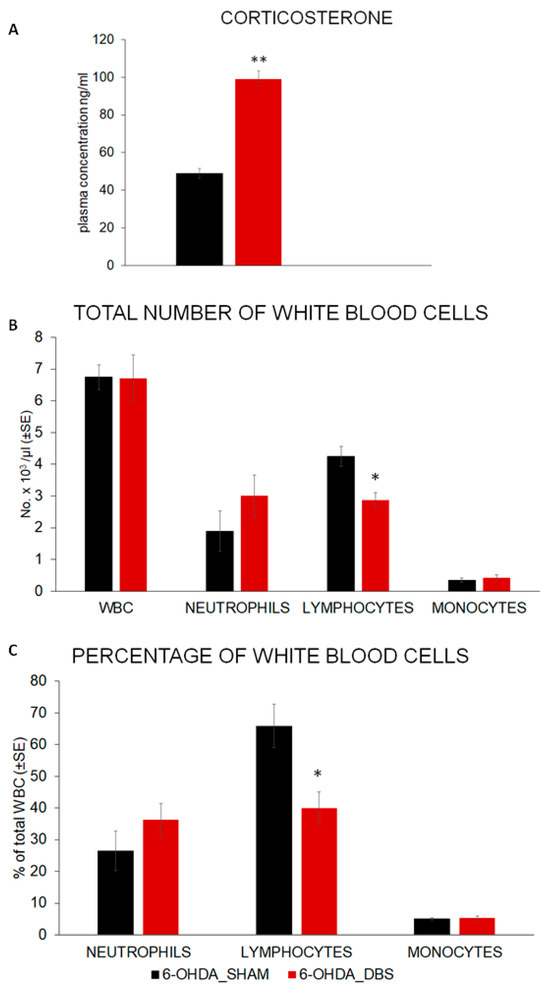 Effect of DBS-STN on plasma corticosterone concentration (A), peripheral blood leukocyte percentage (B), and number (C) in the DBS-STN (6-OHDA_DBS, n = 6)- or SHAM (6-OHDA_SHAM, n = 6)-stimulated rats within model of early PD. Data are means ± SEM. Explanation: * p < 0.05, ** p < 0.01 differences vs. 6_OHDA_SHAM (Mann–Whitney U tests).