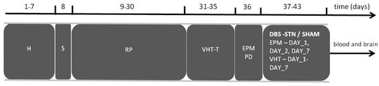 Schematic diagram of experimental timeline in 6-OHDA_SHAM (n = 6) and 6-OHDA_DBS (n = 6) groups. Explanations—H: handling; S: stereotactic electrode implantation into right subthalamic nucleus (STN; AP = −3.6 mm; L = −2.6 mm; D = 8.0 mm) and guiding of cannula into substantia nigra pars compacta (SNpc; AP = −5.3 mm; L = −2.4 mm; D = −7.5 mm) according to [86] coordinates. RP: recovery period in home cage; VHT-T: training for pasta eating in the presence of the experimenter prior to Vermicelli handling test; EPM: elevated maze test before PD model induction and after DBS-STN or SHAM stimulation (1st, 2nd, and 7th day of stimulation); PD: 12 μg of 6 hydroxydopamine dissolved in 4 μL 0.9% NaCl with ascorbic acid microinfusion into the right SNpc. DBS-STN procedures were applied daily for seven days, for 1 h each, with continuous electrical high-frequency stimulation of subthalamic nucleus (current frequency: 130 Hz, pulse width: 60 µs, stimulation intensity: 70–220 µA) in DBS-STN group; VHT: Vermicelli handling test was performed every day after DBS-STN or SHAM stimulation (1st to 7th day of stimulation). Blood and brain collection: blood samples were collected via cardiac puncture.