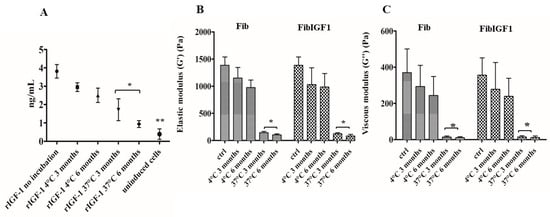 At 3 months, the elastic and viscous moduli of FibIGF1 samples stored at 37 °C significantly decreased by more than 50% compared to the freshly prepared FibIGF1 samples. The addition of IGF-1 could hinder the interaction between the fibrinogen chains and thrombin during polymerization, resulting in dangling ends within the polymer chain segments. This might lead to crosslink imperfections during polymerization, resulting in a decrease in the mechanical properties of FibIGF1 at 37 °C []. Based on the results presented here, FibIGF1 can be safely stored at 4 °C for 6 months before use.