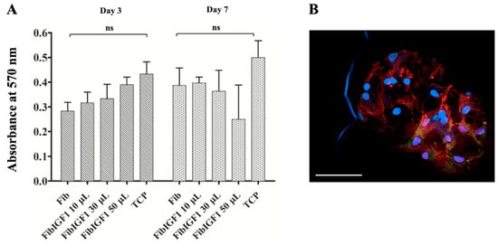 Fibrin is a biocompatible and non-toxic natural polymer; however, manufacturing residuals such as surfactants and oil could be critical as they might evoke cytotoxic reactions. The MTT assay was conducted on bovine chondrocytes to assess the cytotoxicity of different fibrin sample groups. The MTT assay is a simple, versatile assay that complies with the requirements of biocompatibility testing for new materials []. Based on the cytotoxicity and DAPI/phalloidin staining results, both FibIGF1 and plain fibrin microbeads supported the growth, adhesion, and migration of the bovine chondrocytes. No significant metabolic activity changes were seen in bovine chondrocytes cultured with either FibIGF1 or plain fibrin compared with the TCP on days 1 and 7. On the other hand, the cell metabolic activity was slightly reduced in the FibIGF1 group compared to the TCP and plain fibrin groups on day 7. This decrease might be associated with chondrocyte phenotype maintenance at high cell seeding conditions []. Moreover, a large percentage of viable cells attached, migrated, and created a network on the fibrin microbeads, as confirmed by phalloidin/DAPI staining (Figure 2B). The chondrocytes maintained their round shapes with an evident actin network when they were cultured with the fibrin microbead samples. The results of this study indicate that all tested groups had good biocompatibility for cartilage repair. These results were expected because fibrin-based biomaterials have ideal biocompatibility and biodegradability and strong adhesion to biological surfaces [].