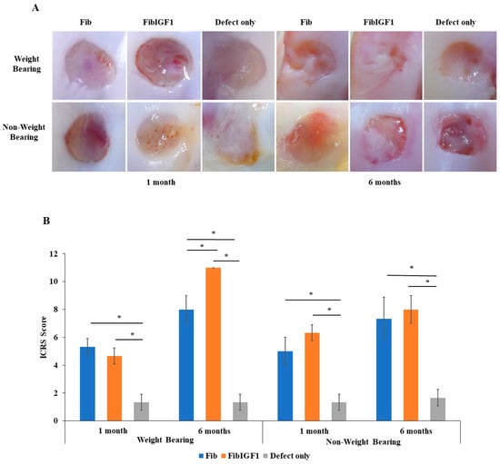 Macroscopic observation and the International Cartilage Repair Society (ICRS) scoring of chondral defect repair in each group at 1 and 6 months post-surgery. (A) Representative macroscopic images of weight-bearing and non-weight-bearing groups, with different cartilage healing treatments. (B) Macroscopic ICRS scoring of chondral defect repair. The group treated with either Fib or FibIGF1 had significantly increased scores compared to the defect group, with higher scoring in the FibIGF1 group (n = 3, * p < 0.05).