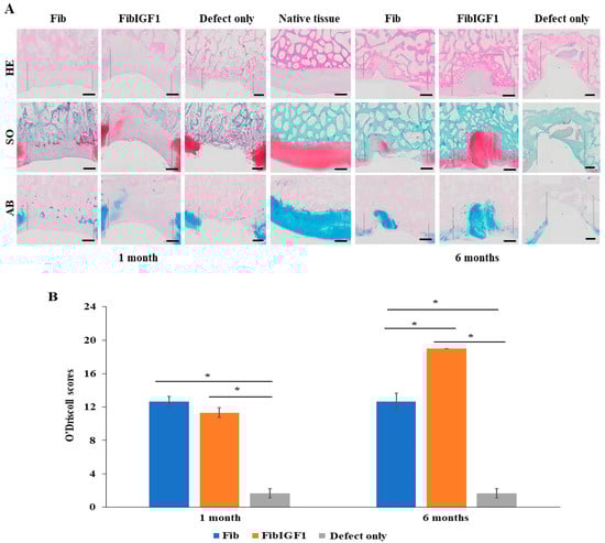 Histological results and O’Driscoll scores of cartilage defects in different groups at 1 and 6 months post-surgery. (A) Representative images of HE-stained sections of normal cartilage tissue at 1 month after surgery. No new tissue formation was observed with the defect-only sample. The arrows show the defect site. Representative images of HE-stained (purple chondrocytes), SO-stained (red proteoglycan, chondrocytes, and type II collagen), and AB-stained (blue glycosaminoglycans) sections of articular cartilage and subchondral bone tissue at months 1 and 6. Incomplete healing with fibrous tissue filling was observed in the defect site at 1 month post-operation. Compared to fibrin-only injection groups, more cartilage-like tissue was observed in the regenerated area at 6 months post-injection of IGF-1-loaded fibrin (FibIGF1). The images chosen from the defects created on the weight-bearing zones. The black dotted lines denote defect borders. Scale bars represent 1 mm, magnification 10×. (B) A bar graph illustrating macroscopic International Cartilage Repair Society scoring results (ICRS) of chondral defect repair. Significance is represented by * compared to other groups at same time point, compared to the same group at different time points (n = 3. Error bar = ± SD).