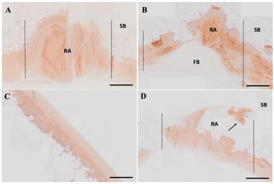 Immunohistochemical staining for type II collagen protein expression (brown) in the defect area for different groups. Abbreviations: Subchondral bone (SB), regenerated area (RA), and fibrotic tissue (FB). Representative images of type II collagen protein-stained section of (A) IGF-1-loaded fibrin (FibIGF1) injection sample, (B) fibrin-only injection sample, (C) normal cartilage tissue. (D) Host cell infiltration from the subchondral bone layer towards the defect area (shown with black arrow) at 6 months after surgery, specifically observed in FibIGF1 samples. The images chosen from the defects created on the weight-bearing zone. The black dotted lines denote defect borders. Scale bars represent 1 mm, magnification 10×.