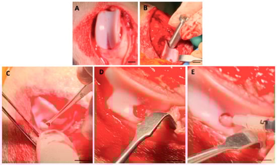 Following the administration of general anesthesia by intravenous ketamine (5 mg/kg) and diazepam (0.2 mg/kg) injection, the knee joints were surgically approached through medial parapatellar incisions under aseptic conditions []. The articular surface was exposed by laterally dislocating the patellae. By using a custom-made cylindrical chondrotome, a full-thickness chondral defect measuring 5 mm diameter and 2 mm depth was created on the weight-bearing region of the medial condyle of the left knee joint of each goat (Figure 6A,B). A similar defect was also created at a site in a non-weight-bearing region superior to the one previously created (patellofemoral region) (Figure 1C,D) and filled with Fib and FibIGF1, for Groups 1 and 2, respectively (Figure 1E).