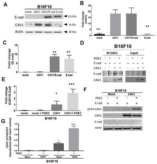 B16F10 melanoma cells were stably transfected with either the empty vector (pLacIOP) or the plasmid with a CAV1-encoding insert (pLacIOP-CAV1). This plasmid allows IPTG-inducible expression of CAV1. Indeed, CAV1 levels increased in B16F10 (CAV1) cells in the presence of IPTG (Figure 1A,B) by around 10-fold compared to B16F10 (mock) cells (18 ± 2.0 and 1.7 ± 0.3, respectively; Figure 1B). E-cad was transiently expressed in B16F10 (mock) and B16F10 (CAV1) cells via transfection with pBATEM, a plasmid that encodes E-cad (8.8 ± 1.0 and 7.3 ± 0.9, respectively, Figure 1C). Following transfection, E-cad expression increased at least 7-fold in the B16F10 (E-cad) and B16F10 (CAV1/E-cad) cells when compared to non-transfected cells (Figure 1A,C). The formation of the CAV1/E-cad complex was evaluated in co-immunoprecipitation assays in the presence or absence of PGE2 in B16F10 (Mock), B16F10 (CAV1), B16F10 (E-cad), and B16F10 (CAV1/E-cad) cells (Figure 1D–G). Our group previously showed that CAV1 co-immunoprecipitates with β-cat in the presence of E-cad [44]. Consistent with previous findings, E-cad was readily detectable in CAV1 immunoprecipitates (Figure 1D) obtained from B16F10 (CAV1/E-cad) but not in B16F10 (CAV1) cells. Interestingly, in the presence of PGE2, the CAV1/E-cad ratio increased at least 3-fold compared to untreated B16F10 (CAV1/E-cad) cells (Figure 1E), indicative of a decrease in E-cad presence in these complexes.