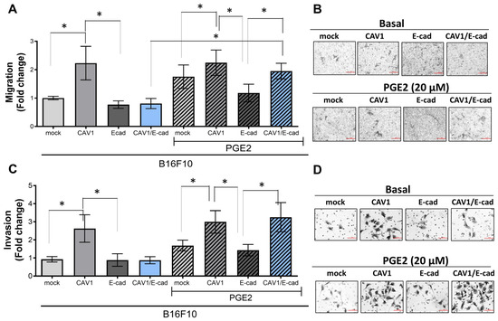 PGE2 enhances migration and invasion of B16F10 (CAV1/E-cad) cells. B16F10 (mock) and B16F10 (CAV1) cells cultured in the presence of IPTG (1 mM) were transiently transfected with pBATEM to overexpress E-cad. After 48 h, B16F10 (mock), B16F10 (CAV1), B16F10 (E-cad), and B16F10 (CAV1/E-cad) cultures were treated with 20 μM PGE2 for another 24 h, and then cell migration and invasion were evaluated. (A) B16F10 (mock), B16F10 (CAV1), B16F10 (E-cad), or B16F10 (CAV1/E-cad) cells (150,000) treated or not with PGE2 were seeded in Boyden chambers (transwells) in the presence or absence of 20 μM PGE2 and allowed to transmigrate for 16 h. The graph shows the fold change in the migration of cells treated or not with PGE2, normalized to B16F10 (mock) control cells. Significant differences are shown (* p < 0.05, n = 3). (B) The panels show representative images from the migration assays of cells in the absence (upper panel) or presence (lower panel) of PGE2. Magnification bar = 50 µm. (C) Cells treated or not with PGE2 (20 µM) for 24 h were used for the invasion assays. Cells (150,000) were seeded in matrigel Boyden chambers in the absence or presence of PGE2 (20 μM). Cell invasion was measured after 24 h. The graph shows the fold change in invasion normalized to B16F10 (mock) control cells. Significant differences are shown (* p < 0.05; n = 3). (D) The panel shows representative images of the invasion assays in the absence (upper panel) or presence (lower panel) of PGE2. Magnification bar = 50 μm.