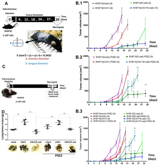 Mice between 6 and 8 weeks of age were used for experiments (approved by the local bioethics of FCV). B16F10 (Mock) (n = 8/8), B16F10 (CAV1) (n = 8/8), B16F10 (E-cad) (n = 9/9), and B16F10 (CAV1/E-cad) (n = 10/8) cells (1 × 105 cells), either pre-stimulated or not, with 50 µM of PGE2 for 16 h (n = mice injected with pre-stimulated cells/mice injected with non-stimulated cells), were injected subcutaneously into the flanks of C57BL/6 mice. Tumor growth was monitored via palpitation (volume = width2 × length × π/6), as described [39].
