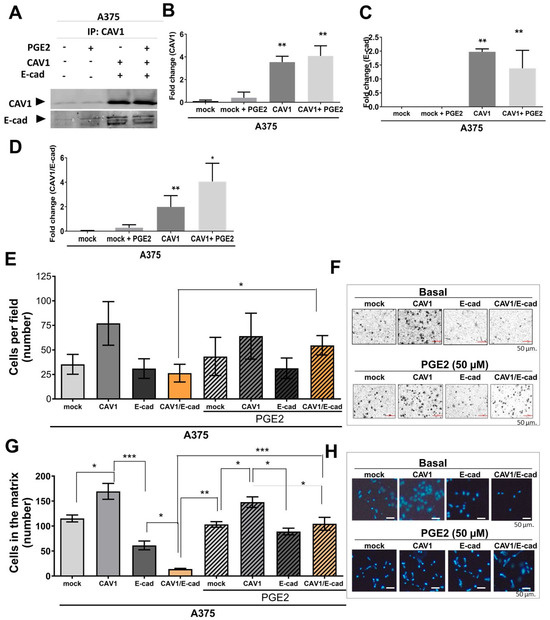 We also corroborated these observations using the human melanoma line A375, which has elevated basal expression levels of CAV1 in comparison to B16F10 cells. There too, increasing the expression of E-cad via transient transfection with the plasmid pBATEM resulted in complex formation with CAV1, as indicated with co-immunoprecipitation experiments (Figure 4). Importantly, incubation of the A375 cells expressing both CAV1 and E-cad with PGE2 reduced the presence of E-cad in the co-immunoprecipitates with CAV1. Moreover, consistent with the results in B16F10 cells, phosphorylation of CAV1 tyrosine-14 in A375 cells was significantly increased in the presence of PGE2 (Figure S2).