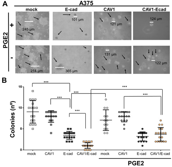 Clonogenic assays: A375M (Mock), A375M (CAV1), A375M (Mock/E-cad), and A375M (CAV1/E-cad) cells were treated for 5 h with PGE2 (50 μM). Then, these cells were seeded (3 × 103 cells) in 0.2% agarose in low-adhesion plates. After 24 h, medium supplemented with 10% FBS and PGE2 was added to each well as indicated, and 7 days later, the colonies larger than 50 μm were considered viable. On day 14, colonies were quantified, and only colonies larger than 100 μm were considered for further analysis, as previously described [71,72].
