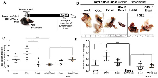 Pathogen-free immunodeficient B16Rag1−/− (B6.129S7 Rag1<tm1Mom>/J) mice were obtained from Jackson laboratories and maintained as indicated above. Immunosuppressed C57/B6Rag1−/− mice were inoculated via intraperitoneal injection with 2.5 × 106/250 µL of A375M (Mock), A375M (CAV1), A375M (E-cad), and A375M (CAV1/E-cad) cells, pre-stimulated or not, with 50 µM of PGE2 for 5 h in serum-free medium. Then, spleen and abdominal metastasis were quantified using parameters such as the total mass of spleens with tumors and abdominal tumor mass.
