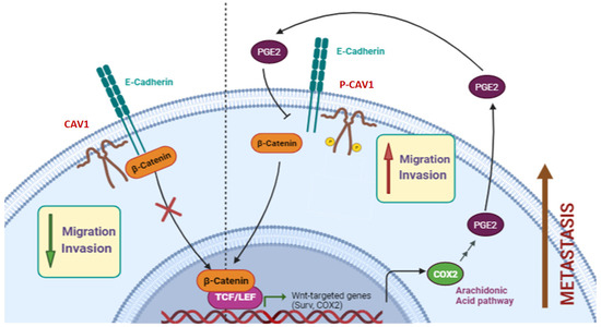 Our earlier work identified CAV1 as a potent negative regulator of genes whose expression favors the development and progression of cancer [39,44]. However, this was only the case in cell lines that co-expressed CAV1 and E-cadherin. In such cancer cells, CAV1 promotes β-cat recruitment to the plasma membrane, thereby precluding upregulation of β-cat/Tcf-Lef target genes like survivin and COX-2 [34]. COX-2 proteins are endoperoxide synthase enzymes that convert arachidonic acid into prostaglandin E2 (PGE2), among other prostanoids, initiating a sequence of events that interconvert various lipid mediators of inflammation [4,5]. Studies from our group have shown that treatment of cancer cells with PGE2 promotes the liberation of β-cat from the multiprotein complex that it forms with CAV1/E-cad [35]. Since, as indicated above, the COX-2 gene is a target of the β-cat/Tcf-Lef pathway, PGE2, a product of COX-2 activity, also regulates COX-2 expression. Therefore, a self-feeding amplification loop is generated, which may explain why the COX-2 genes are frequently upregulated in cancer and implicated in promoting metastasis.