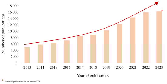 Data from the Elsevier database on the number of published scientific articles for the period 2013–2023; keyword: “polymers for biomedical applications” (in title, abstract). Source: own elaboration based on data from Elsevier database [1] as of 20 October 2023.