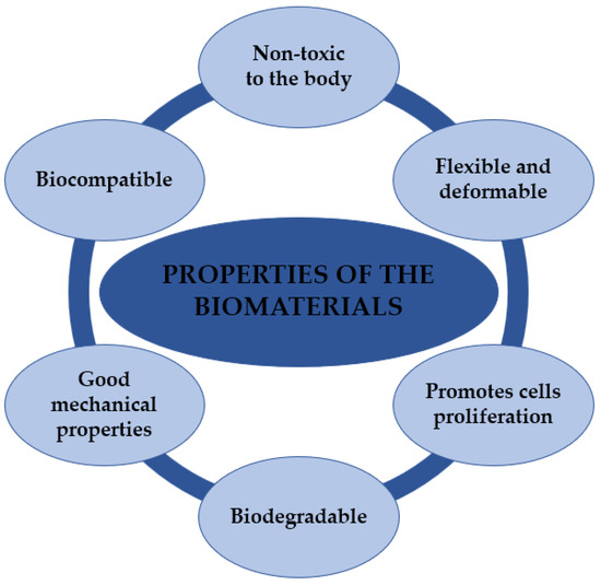 All polymeric materials that are used for internal use must meet certain—sometimes even stringent—requirements. Depending on where the biomaterial is applied, the requirements may vary somewhat. Biomaterials, in this case biopolymers, should be characterized by certain properties (Figure 5) that, firstly, will enable them to fulfill the required functions, and secondly, will not change under the influence of interaction with the body and the prevailing variable conditions in it, such as temperature, pressure, antigens or the action of X-rays or magnetic fields. All implanted implants cannot cause genetic changes, nor can they react with blood, which would lead to changes in its composition. Biodegradable polymers must not break down into products that are harmful to the body. They should not cause inflammation or infection or induce immunogenic reactions. The degradation time of polymers should be matched and sufficient for the time required for tissue and organ regeneration and reconstruction. The larger the polymer chain of the material, the longer the degradation time of the material will be [92,93].