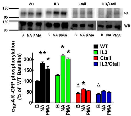 NA- and PMA-induced α1B-AR phosphorylation. Cells expressing the WT receptor or the distinct receptor mutants (IL3, Ctail, and IL3/Ctail) were incubated in the absence of any agent (B, baseline) or the presence of either 10 µM NA (2 min) or 1 µM PMA (15 min). Receptor phosphorylation is expressed as the percentage of the WT baseline values. The means are plotted, and error bars indicate the S.E.M. of 3 experiments performed on different days using different cell cultures. ** p < 0.01 vs. its respective baseline value; * p < 0.05 vs. its respective baseline value; Δ p < 0.01 vs. WT baseline value. Representative autoradiographs (32P) and Western blots (WB) are presented above the graph.