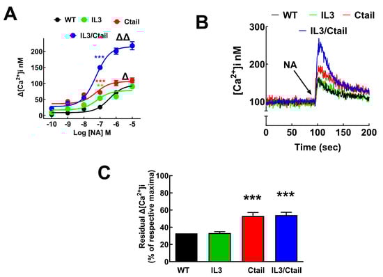 Figure 2A shows that in cells expressing WT α1B-ARs, NA increased intracellular calcium in a concentration-dependent fashion; the maximal calcium concentration increase was 90 ± 10 nM, and the EC50 was 380 ± 40 nM. The maximal increases in calcium concentration in cells expressing the IL3 and Ctail mutants were similar to those of the wild type, i.e., 67 ± 7 nM (IL3) and 90 ± 8 nM (Ctail). However, a shift to the left in the concentration–response curves was noticed (the EC50 values were 65 ± 10 nM (IL3) and 56 ± 7 nM (Ctail); p < 0.001 vs. cells expressing the WT receptor) (Figure 2A). Interestingly, cells expressing the IL3/Ctail mutant exhibited a considerably larger maximal response (187 ± 20 nM; p < 0.001 vs. the effect of the other receptors at 10 µM NA), as well as a shift to the left in the concentration–response curve when compared to the WT (EC50 60 ± 8 nM; p < 0.001 vs. cells expressing the WT receptor). The previous data are the means ± SEMs of 10 concentration–response curves performed with distinct cell cultures in each case.