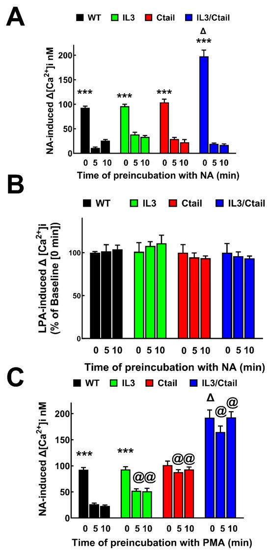 Calcium response to NA in cells preincubated with NA or PMA. In panels (A,B), cells were preincubated without (time 0) or with 10 µM NA for 5 or 10 min, washed, and subjected to sequential stimulation with 10 µM NA and 1 µM LPA. Panel (A) shows the increases in intracellular calcium in response to NA. *** p < 0.001 vs. the other columns of the group; Δ p < 0.001 vs. no incubation (time: 0 min) of the other receptors. Panel (B) shows the increases in intracellular calcium in response to LPA (expressed as the percentage of the baseline value obtained with each cell line). In panel (C), cells were preincubated without (time 0) or with 1 µM PMA for 5 or 10 min, then challenged with 10 µM NA. *** p < 0.001 vs. the other columns of the group; Δ p < 0.001 vs. no incubation (time: 0 min) of the other receptors; @ p < 0.001 vs. 5 and 10 min of cells expressing the WT receptor. The means are plotted, and error bars indicate the S.E.M. of 10–12 experiments performed on different days using different cell cultures.