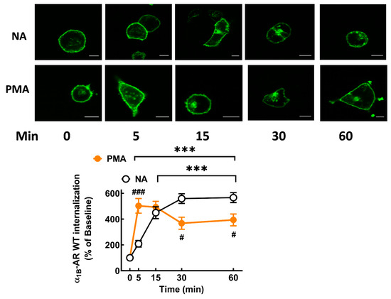 It is well known that α1B-ARs internalize in response to agonists and protein kinase C activation [9,11,12,13]. We explored the effects of 10 µM NA and 1 µM PMA on receptor internalization. As shown in Figure 4, both agents induced receptor internalization; PMA-induced internalization was rapid, observed at 2 min, whereas the action of NA reached the maximum at 30 min.