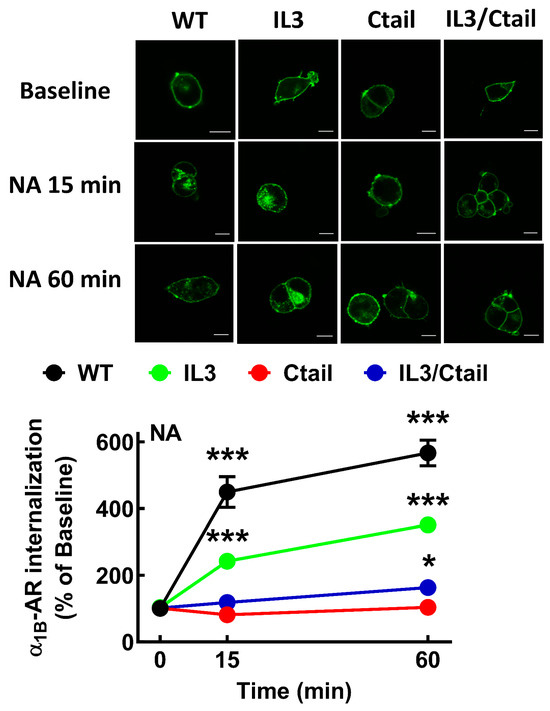 Time course of NA-induced eGFP-tagged α1B internalization in cells expressing WT or mutant α1B-ARs. Cells were incubated for 15 or 60 min with 10 µM NA. Internalization is presented as the percentage of baseline intracellular fluorescence. The means are plotted, and error bars indicate the S.E.M. of 25–30 images obtained from 4 experiments performed on different days and cell cultures; where no error bars are presented, they are presented within the symbol. *** p < 0.001 vs. time 0; * p < 0.05 vs. time 0. Representative images are presented above the graph. Bars indicate 10 µm.