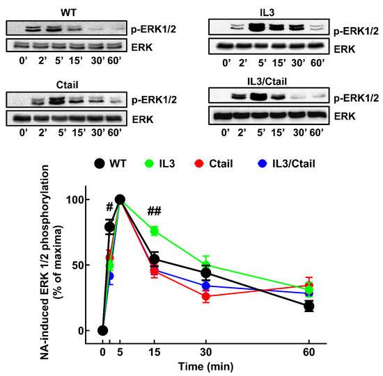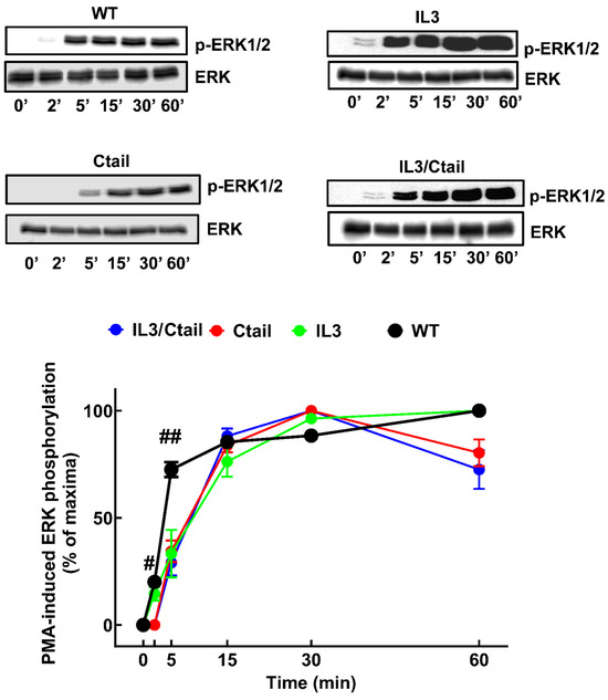 Time course of PMA-induced ERK phosphorylation in cells expressing WT or mutant α1B-ARs. Cells were incubated for the times indicated with 1 µM PMA. # p < 0.001 vs. Ctail and IL3/Ctail receptors at 2 min; ## p < 0.001 vs. cells expressing the receptor mutants at 5 min. Other indications are the same as in Figure 7.