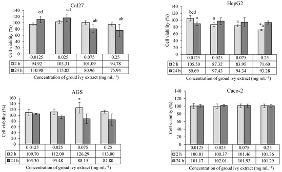 In the case of AGS cells, 0.075 mg mL−1 of the ground ivy extract was the only concentration that had a statistically significant increase (p < 0.05) in the survival rate compared with the control after treatment for 2 h, while in the case of Caco-2 cells, the extract had no effect on survival rate at the tested concentrations, regardless of the treatment duration (2 h or 24 h). Grabowska et al. [8] also reported no cytotoxic effect of water or ethanol extracts of ground ivy on Caco-2 cells at the tested concentrations (10–100 μg mL−1).
