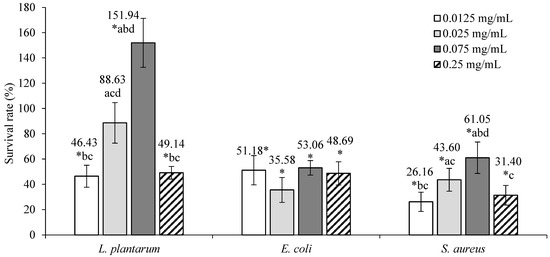 Bacterial cultures (Escherichia coli, Lactobacillus plantarum and Staphylococcus aureus) were grown to the exponential growth phase in appropriate liquid culture media. After washing, 100 μL of the bacterial suspension was inoculated into a 96-well microtiter plate. The bacterial suspension was treated with 100 μL of different concentrations (0.0125, 0.025, 0.075 and 0.25 mg mL−1) of the ground ivy extract. A bacterial suspension treated with 100 μL of the appropriate liquid culture medium served as a negative control. After 40 min of incubation at 37 °C, microdilutions were prepared and subsequently, 10 μL of each dilution was inoculated onto the appropriate solid culture media. The cells were grown at 37 °C for 24 h. The number of colonies grown (CFUs—colony-forming units) was then counted. The survival rates of bacteria after treatment with different concentrations of ground ivy extract were calculated according to Equation (2):