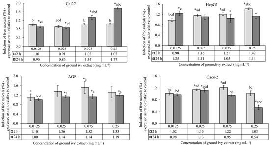 Compared with the control, a significant (p < 0.05) increase in the concentration of free radicals was observed in HepG2 cells after 2 h of treatment with all except the lowest concentrations of extract (0.0125 mg mL−1); however, after 24 h of treatment, there was no statistically significant difference in comparison to the control. Liver HepG2 cells are metabolically active, thus this result is expected. The presence of free radicals was monitored after initial exposure (2 h of treatment) to a mixture of compounds that are metabolized in the liver cells, but their presence returned to levels similar to those in untreated cells over the next 24 h. Additional damage to cellular macromolecules caused by free radicals in liver cells is not expected with prolonged exposure to ground ivy extract.