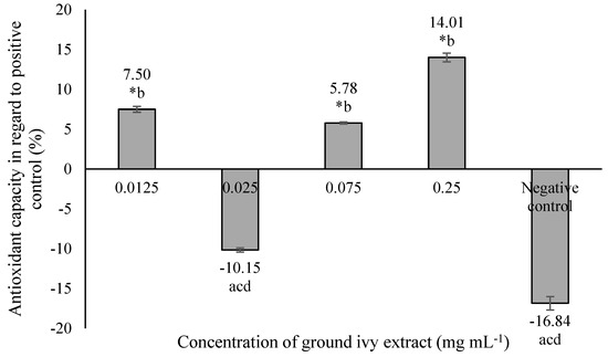 The most significant antioxidant activity—14.01% more than the positive control—was obtained at the highest tested concentration of 0.25 mg mL−1, while the 0.025 mg mL−1 concentration resulted in a pro-oxidant effect that was statistically equal (p > 0.05) to that of the negative control. The antioxidant capacity of ground ivy extract can be attributed to the presence of polyphenolic compounds; this is supported by the results of the research by Ou et al. [26], who reported the inhibitory effect of rosmarinic acid on the formation of protein carbonyls in the BSA protein model with increasing concentration (6.25–400 μg mL−1).