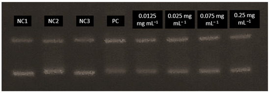 The potential genoprotective effect of ground ivy extract was determined using the plasmid phiX174 RF1 DNA. In addition to the effect of the extract, the plasmid was exposed to hydroxyl radicals generated by the action of UV radiation on H2O2. After treatment, agarose electrophoresis was performed, and the resulting bands were visualized by staining the gel with ethidium bromide solution (Figure 5). When DNA damage occurs, the plasmid changes its conformation from a supercoiled form to a relaxed form, resulting in its slower movement through the gel.
