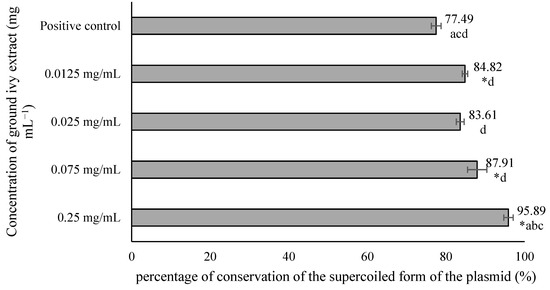 Effect of ground ivy extract on plasmid phiX174 RF1 DNA. *, statistically significant difference compared with the positive control (p < 0.05); a, statistically significant difference compared with 0.0125 mg mL−1 (p < 0.05); b, statistically significant difference compared with 0.025 mg mL−1 (p < 0.05); c, statistically significant difference compared with 0.075 mg mL−1 (p < 0.05); d, statistically significant difference compared with 0.25 mg mL−1 (p < 0.05).