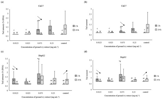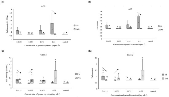 Effect of ground ivy extract on genetic materials of Cal27 (a,b), HepG2 (c,d), AGS (e,f) and Caco-2 (g,h) cells determined by tail intensity (a–d) and tail moment. *, statistically significant difference compared with the control (p < 0.05); a, statistically significant difference compared with 0.0125 mg mL−1 (p < 0.05); b, statistically significant difference compared with 0.025 mg mL−1 (p < 0.05); c, statistically significant difference compared with 0.075 mg mL−1 (p < 0.05); d, statistically significant difference compared with 0.25 mg mL−1 (p < 0.05); -, statistically significant difference (increase or decrease depending on the direction of the arrow) between 2 and 24 h treatments at the same concentration.