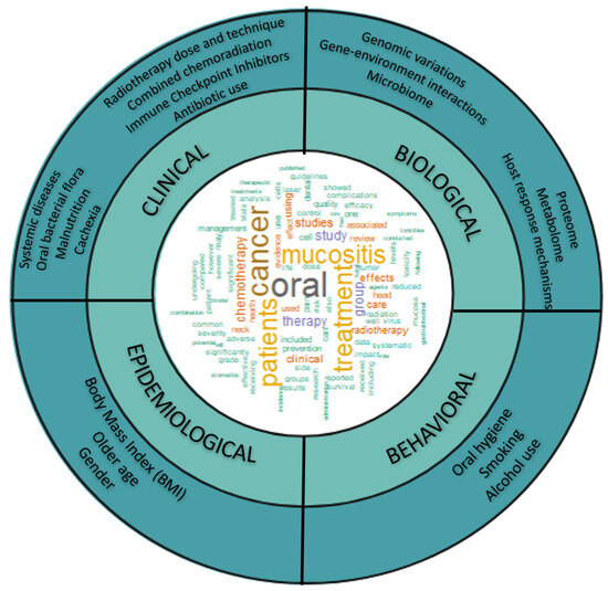 Oral mucositis phenotype is heterogenous and known to vary by epidemiological clinical, and behavioral factors and molecular markers of risk. Word cloud showing frequency of appearance of terms related to oral mucositis based on the abstract of publications for oral mucositis.