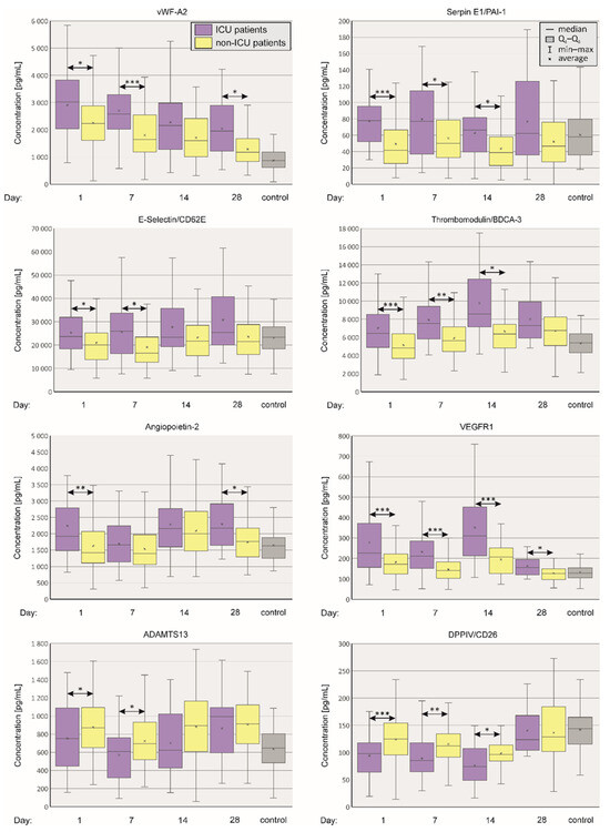 Plasma levels of Endothelin-1 were significantly elevated in non-ICU patients on day 7, while concentrations of Angiopoietin-2 were markedly increased in the ICU group on day 1. Concentration of VEGFR1 was significantly increased in the ICU group on days 1, 7, 14 and 28. The analysis revealed that the concentration of ADAMTS 13 was significantly increased in non-ICU patients on days 1 and 7 (thus severe disease is associated with diminished ADAMTS 13 level). FLT-3 concentration was significantly increased in ICU patients only on day 28. Plasma DPPIV was elevated in non-ICU patients on days 1, 7 and 14.