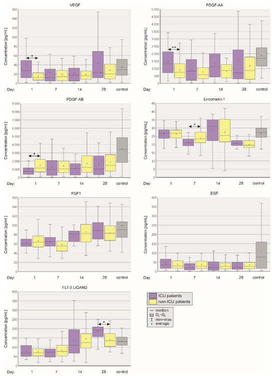 Figure 2 depicts plasma levels of vascular agents which were less associated with the severity of the disease. We did not detect any difference between SARS-CoV-2 positive individuals and healthy controls in plasma EGF and FGF1 levels. Moreover, plasma VEGF and PDGF-AA concentrations were significantly higher in the ICU group only on day 1, while PDGF-AB concentration was significantly higher on day 1 in the non-ICU group. FLT-3 concentration was significantly increased in ICU patients only on day 28. There were no statistically significant differences in concentrations of FGF-1 between the groups.