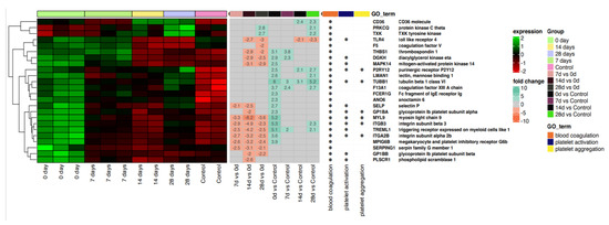 The bioinformatics analysis of genes and processes associated with blood coagulation. Heatmap with hierarchical clustering of differentially expressed genes (categorized according to gene ontology biological process terms—GO BP) in response to COVID-19-induced vascular stress in all analyzed groups (on days 0, 7, 14, 28 and control). Expression values are scaled by rows and presented as a color gradient ranging from red (low expression) to green (high expression). Log2 signal intensity values for any single gene were resized to Row Z-score scale (from −2, the lowest expression, to +2, the highest expression for a single gene). Gene symbols and gene names of differentially expressed genes were shown. Values (from −10 to +10) representing the average fold changes in gene expression between pairs of compared groups were also presented as a color gradient.