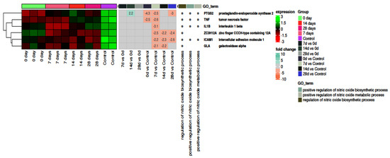 The bioinformatic analysis of genes and processes associated with nitric oxide-related actions. Heatmap with hierarchical clustering of differentially expressed genes (categorized according to gene ontology biological process terms—GO BP) in response to COVID-19-induced vascular stress in all analyzed groups (on days 0, 7, 14, 28 and control). Expression values are scaled by rows and presented as a color gradient ranging from red (low expression) to green (high expression). Log2 signal intensity values for any single gene were resized to Row Z-score scale (from −3, the lowest expression, to +3, the highest expression for a single gene). Gene symbols and gene names of differentially expressed genes were shown. Values (from −10 to +10) representing the average fold changes in gene expression between pairs of compared groups were also presented as a color gradient.